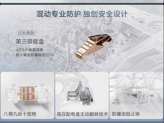 并且除了硬,它還能以柔克剛,創造性的第三吸能盒能夠更好地主動潰縮化解沖擊,即便是40%小偏置碰撞也能讓防火墻變形量降低20%,而且還有八橫九縱十宮格、防撞擊阻止塊以及高壓配電盒主動翻轉技術等創新設計,可以很好確保油電兩種能源的安全。