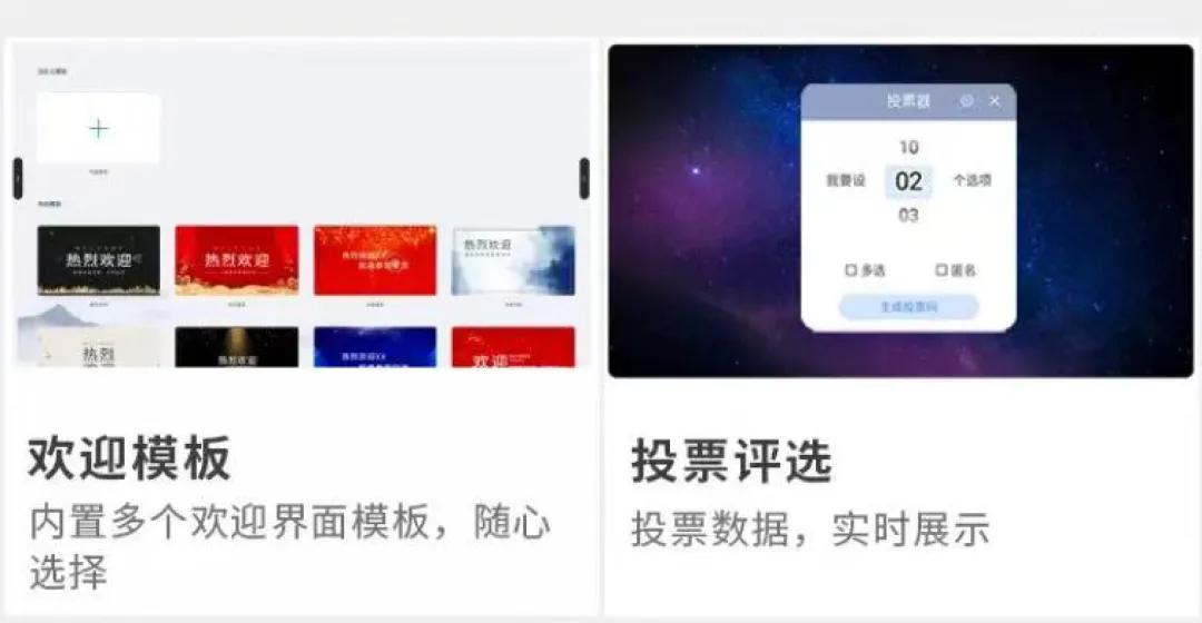 針對會議討論、頭腦風暴、總結記錄等場景需求,該系列產品還搭載了多種實用工具,比如開機歡迎、投票評選等,會議組織者可以在會議過程中根據需求調用不同的工具,實現在線文件分享,實時批注修改,讓會議協作更靈活、更高效。