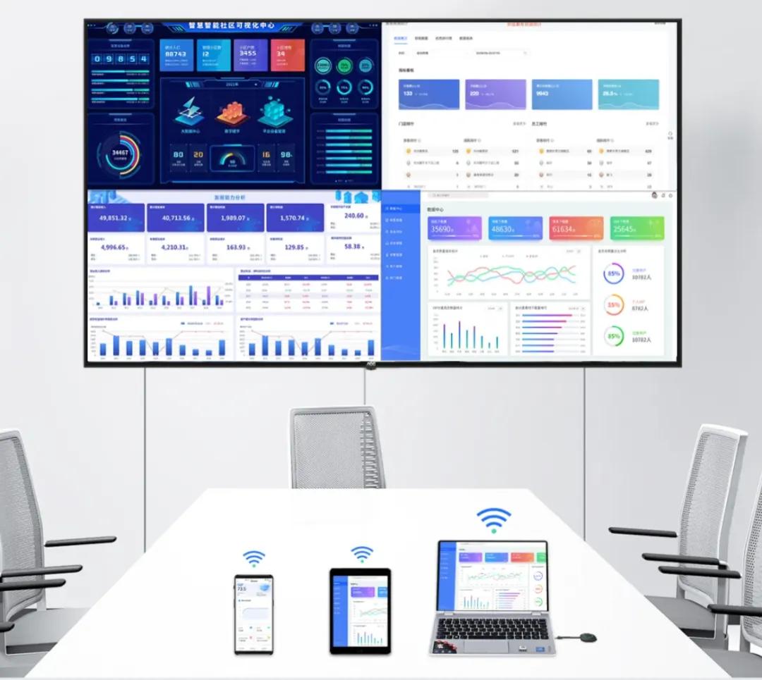 除了強大的內容展示能力,100NT還支持便捷投屏功能,除了手機無線投屏,該系列產品還可以選配專業傳屏器,實現手機、平板、筆記本電腦等移動設備和大屏之間推送、傳屏及控制的全功能多屏互動,大大減少了會議過程中的繁雜流程,更加凸顯該系列產品“輕便操控”的核心設計理念。