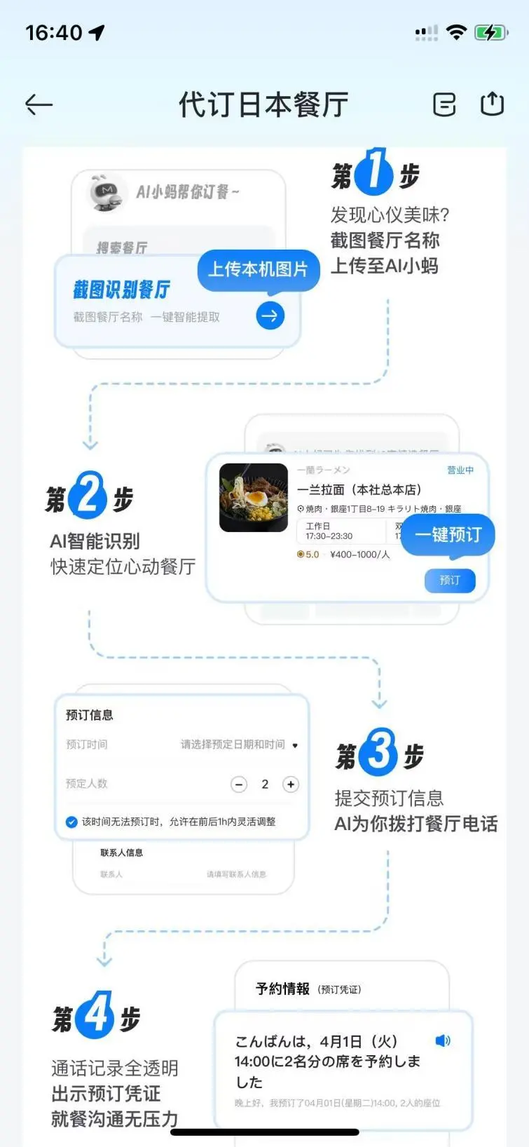 在不斷深化個性化服務的同時,馬蜂窩AI旅行助手“AI小螞“同樣新增三大關注旅行中細節需求的實用功能。日本餐廳很多需要預約,而語言障礙卻曾讓不少游客“頭疼不已”,有了“AI代訂日本餐廳”,用戶只需截圖心儀餐廳界面,AI將自動識別并提取餐廳名稱、地址、營業時間及人均消費,在選定日期、人數及時段后,AI可直接撥打餐廳電話完成預訂,全程無需用戶參與溝通,預訂成功的日文憑證實時同步至手機。