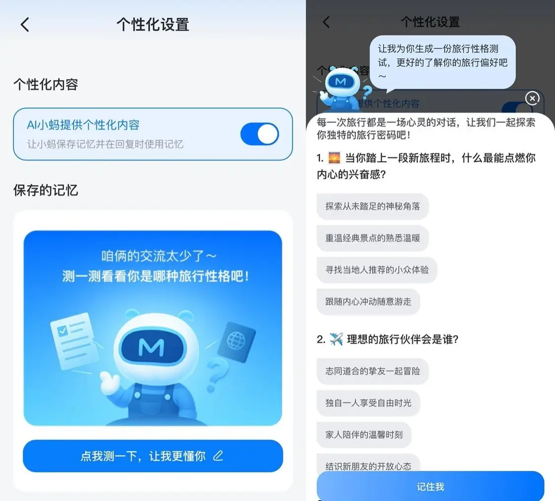 本次全面開放的AI路書最大突破在于其持續學習能力,新增的“旅行性格診斷”功能用幾道簡單感性的問題錨定用戶偏好,將其轉化為個性化標簽,并通過每一次使用逐步加深對用戶的了解,融入到之后的服務細節中。例如,當用戶在規劃中提到“想要少走路”,下次制定行程時,AI會自動規避臺階過多的景點;若歷史記錄顯示用戶更關注“當地人最愛去的地道美食店”,新推薦將主動過濾游客扎堆的網紅店。用戶在馬蜂窩的游記、筆記、收藏內容皆可成為AI的學習素材——偏愛拍攝古建筑的用戶,行程中會自動插入當地古建巡禮等環節。