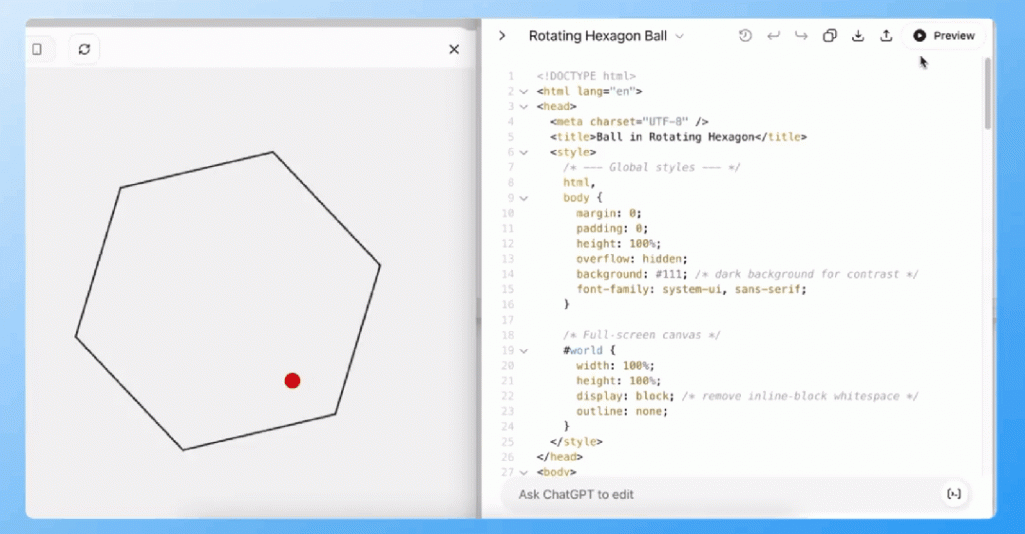 提示詞:Create a HTML, CSS, and javascript where a ball is inside a rotating hexagon. The ball is affected by Earth’s gravity and friction from the hexagon walls. The bouncing must appear realistic.(創建一個包含 HTML、CSS 和 JavaScript 的項目,實現一個在旋轉六邊形內部的球體,該球體受到地球引力和六邊形壁摩擦力的影響,其反彈效果必須看起來逼真。 )