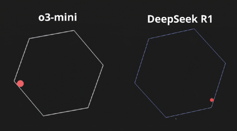首先是物理模擬,讓小球在六邊形內彈跳,以此來測試 AI 是否真正理解重力、碰撞等因果規律和時空關系,同時也測試了模型的代碼能力 。