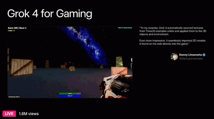 昨天發布會上也展示了一則 Grok 4 在 4 小時內制作的一款 FPS 射擊游戲,效果看起來相當不錯。