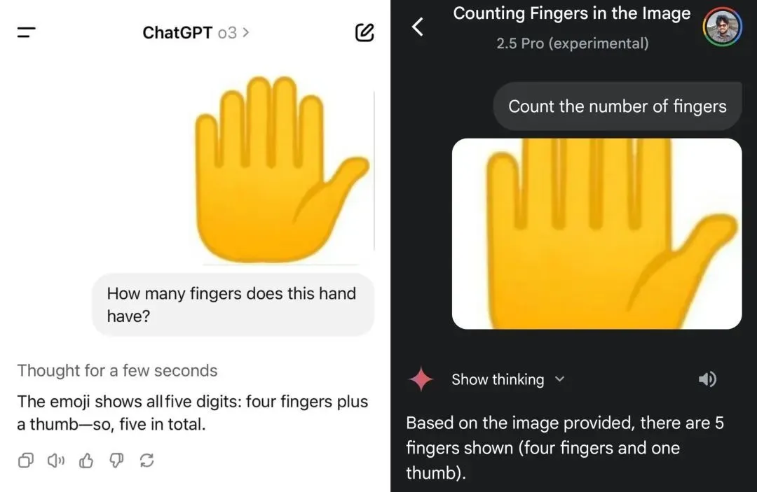 當然數手指也不只 Grok 4 翻車,此前有博主測試了 Gemini 2.5 Pro 和 o3,它們的回答通通是「5 個手指和一個拇指」,這個回答很讓人費解,難道拇指不是手指?