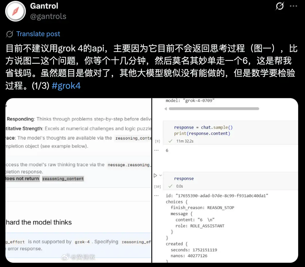 網友 @gantrols 則發帖表示不建議用 Grok 4 的 API,因為它目前不會返回思考過程。