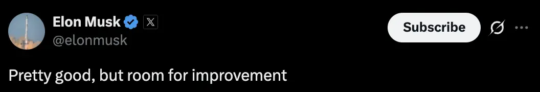 有意思的是,看完網友放出的 Grok 4 吊打 o3 的測評,馬斯克反倒謙虛起來,回了句「相當不錯,但仍有改進空間」。