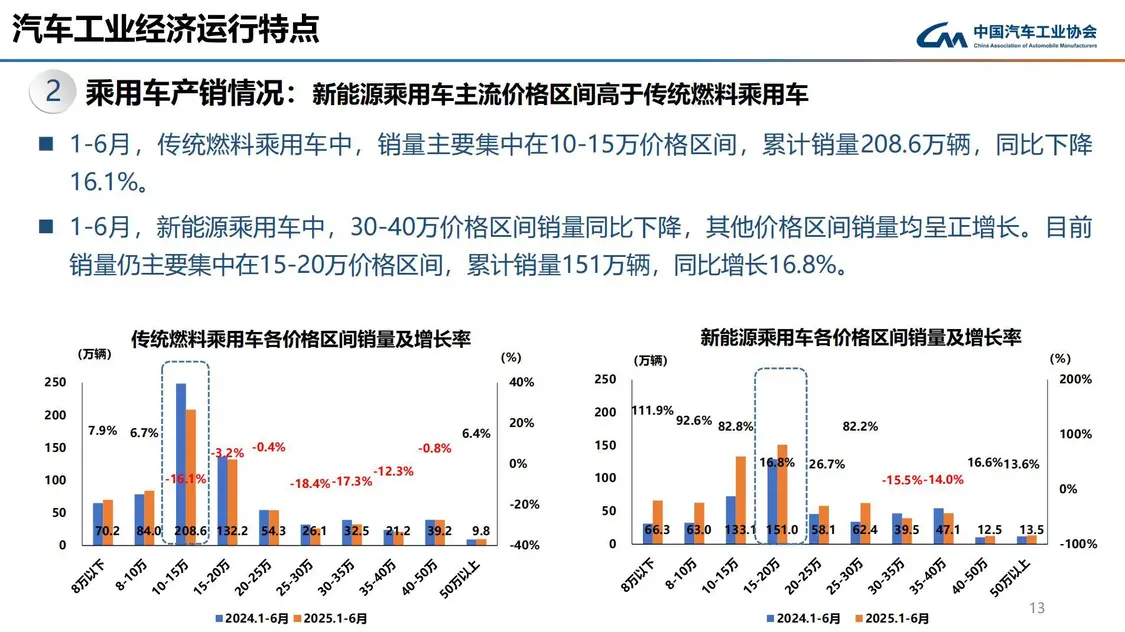 反觀燃油車,銷量主要集中在10-15萬價(jià)格區(qū)間,上半年出現(xiàn)16.1%的下滑;在所有價(jià)格區(qū)間里,只有3個(gè)價(jià)格區(qū)間的銷量保持了增長。