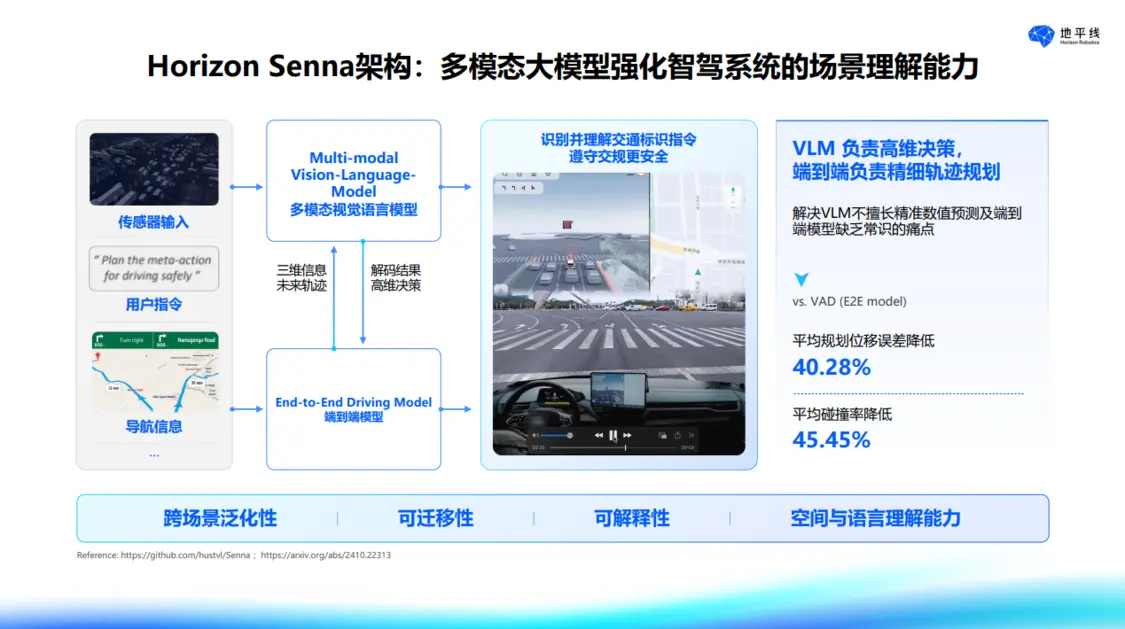 地平線的Senna架構(gòu)是多模態(tài)大模型,將端到端模型與 VLM 相結(jié)合,二者相互協(xié)作,使傳感器信息與地圖信息得到充分利用。實(shí)踐表明,Senna 架構(gòu)相較于端到端模型,平均規(guī)劃位移誤差降低 40% 以上,平均碰撞率下降 45%,在泛化性、可遷移性、可解釋性與語言理解能力方面展現(xiàn)出顯著優(yōu)勢。