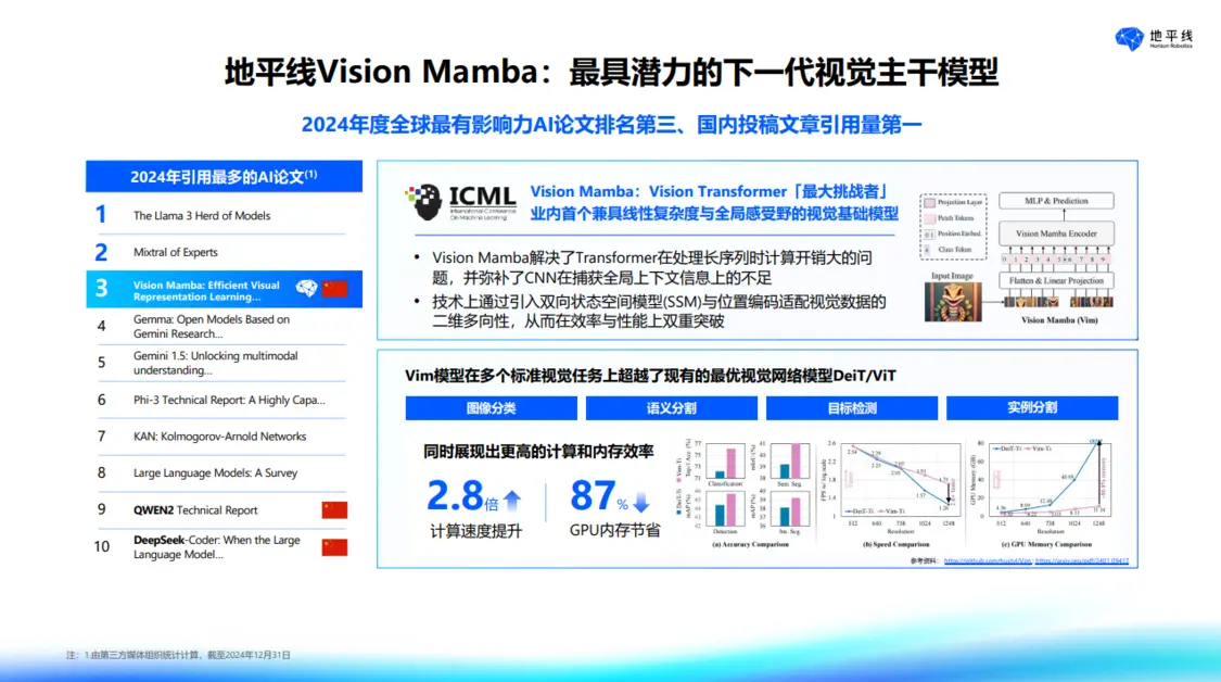 在視覺感知算法方面,地平線經(jīng)歷了從傳統(tǒng)后融合視覺算法到 BEV 算法,再到 BEV 加 Transformer 的演進(jìn)過程。如今,地平線研發(fā)的 Vision Mamba 算法成為行業(yè)新突破。該算法通過引入雙向量狀態(tài)空間與位置編碼器,在解決計(jì)算與視野問題上實(shí)現(xiàn)了效率與計(jì)算資源優(yōu)化,有望成為下一代視覺主干模型。與傳統(tǒng) Transformer 相比,Vision Mamba 在長時(shí)序、高精度要求下計(jì)算速度提升 2.8 倍,GPU 資源占用減少 87%。