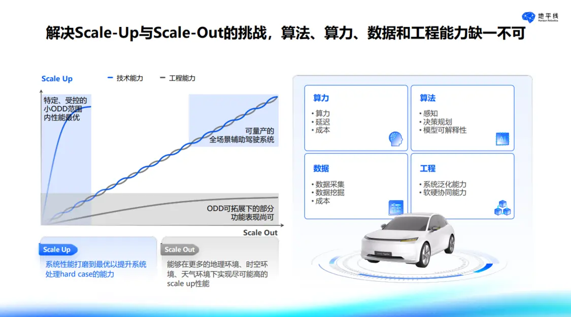 陳黎明博士進(jìn)一步指出,目前,高速NOA已相對 “好用”,但城區(qū) NOA 仍處于 “可用” 階段。城區(qū)復(fù)雜的交通狀況是主要挑戰(zhàn)之一,車輛在行駛過程中要么過于保守,要么過于激進(jìn),這些問題都與系統(tǒng)性能緊密相關(guān)。此外,現(xiàn)有系統(tǒng)還存在使用范圍受限、泛化能力弱以及成本高昂等問題。要解決這些問題,必須同時(shí)實(shí)現(xiàn)系統(tǒng)性能的Scale Up與應(yīng)用場景的 Scale Out。