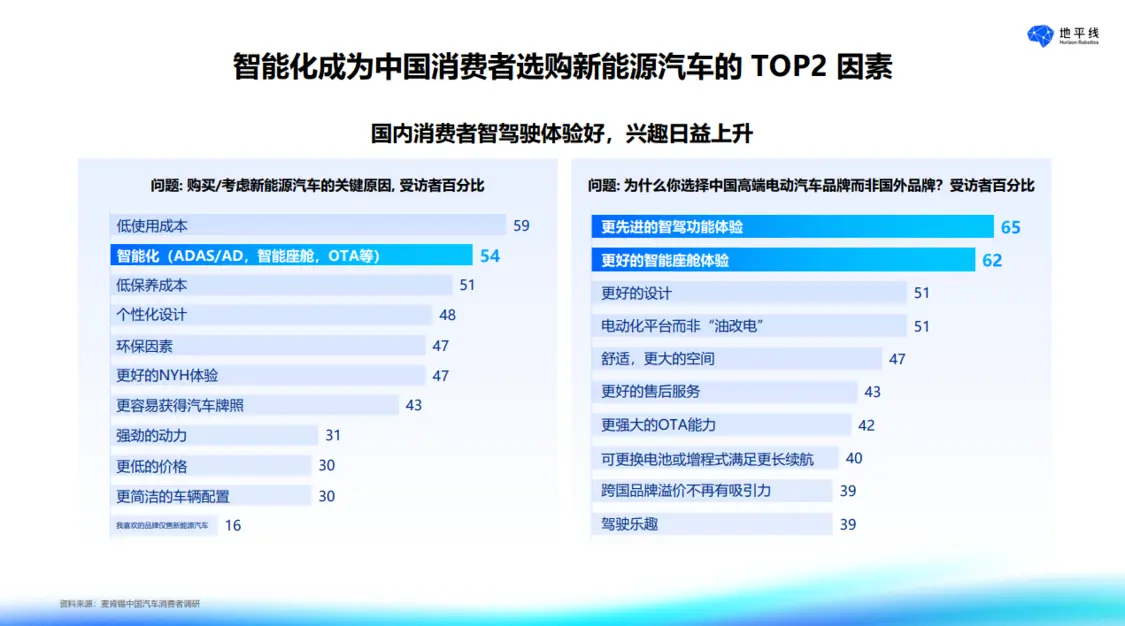 陳黎明博士指出,技術(shù)的創(chuàng)新進(jìn)程在10%至20%的關(guān)鍵節(jié)點(diǎn)時(shí),將面臨增長拐點(diǎn)或創(chuàng)新鴻溝。如今,中高階智能駕駛迎來了關(guān)鍵拐點(diǎn),主要基于以下三點(diǎn)判斷:一是智能駕駛在我國智能網(wǎng)聯(lián)新能源汽車發(fā)展戰(zhàn)略中具有重要地位,從政府工作報(bào)告到國務(wù)院、工信部的規(guī)劃,均明確了智能汽車的發(fā)展方向;二是行業(yè)推動(dòng)作用顯著,城區(qū) NOA、高速 NOA 功能正從高端車型向 15 萬以下車型下探,車企的智駕平權(quán)舉措加速了技術(shù)普及;三是中國終端客戶對智能化的關(guān)注有力拉動(dòng)了市場需求,在選擇電動(dòng)車時(shí),智能化已成為重要因素。
