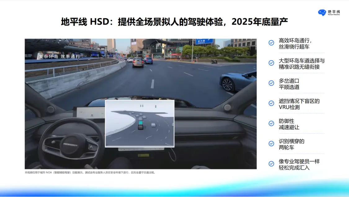 地平線城區(qū)輔助駕駛 Horizon SuperDrive(簡稱 HSD)采用一段式端到端模型,搭配 “安全護(hù)欄” 機(jī)制。在傳感器配置上,HSD 主要依賴 11 個(gè)攝像頭與 1 個(gè)毫米波雷達(dá),激光雷達(dá)為選裝,還配備 12 個(gè)超聲波雷達(dá)。其方案采用導(dǎo)航地圖搭配特定特征信息,無需高精地圖即可實(shí)現(xiàn)城區(qū)智能駕駛,系統(tǒng)表現(xiàn)擬人化,能從容應(yīng)對復(fù)雜交通場景,該產(chǎn)品將于今年量產(chǎn)。