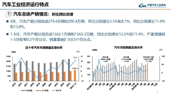 今年1-6月,汽車產銷分別累計完成1562.1萬輛和1565.3萬輛,同比分別增長12.5%和11.4%。
