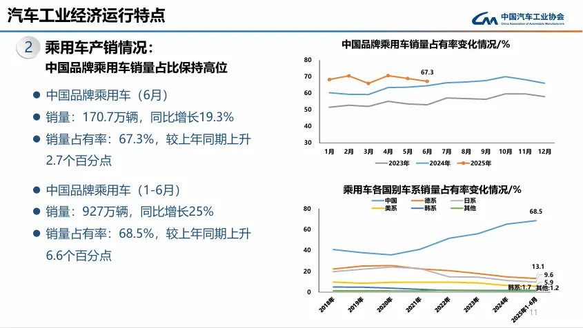 1-6月,中國品牌乘用車共銷售927萬輛,同比增長25%,占乘用車銷售總量的68.5%,占有率比上年同期提升6.6個百分點。相較之下,外資品牌普遍出現份額下滑。與上年同期相比,除韓系品牌銷量小幅增長外,其他四大主要品牌銷量則呈不同程度的下降。