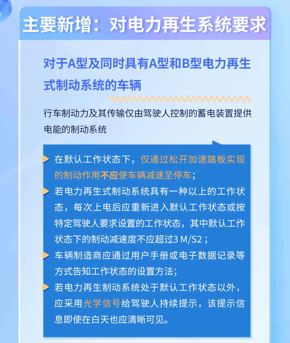 新標準針對A型及同時具有A型和B型電力再生制動系統的車輛有以下明確要求: