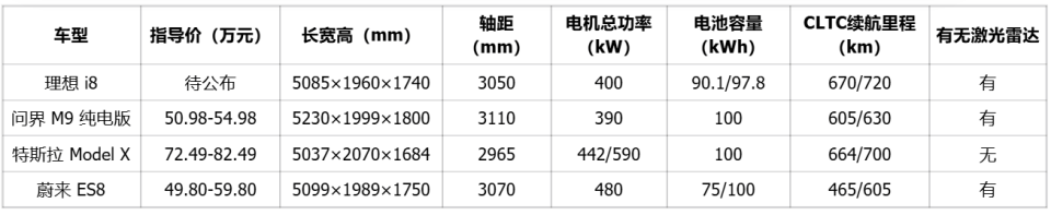 根據理想 i8 的車身尺寸以及網傳 35 - 40 萬的預計售價,我們可以梳理出幾款潛在競爭對手。在這個價格區間和尺寸定位下,問界 M9 純電動版是一個強勁對手。問界 M9 憑借其在鴻蒙智能座艙、乾崑智駕、華為 DriveONE 電驅系統等方面的優勢,在市場上已積累了一定的口碑。