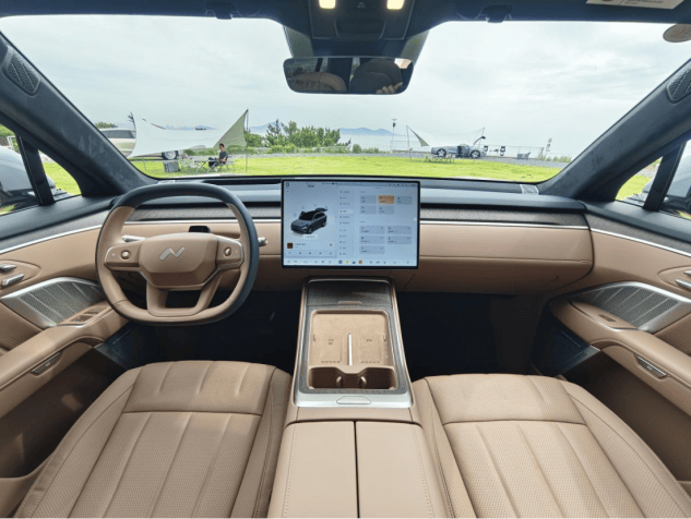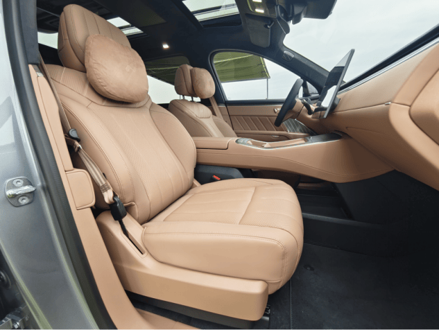 我們也發現整個座艙都是大面積的軟包裹,超纖絨的頂棚。而且內飾還會給你提供四個主題,四個顏色,你也不怕說,孩子多,白內飾容易臟,黑內飾夏天容易熱,樂道L90都給你想好了,不過低配車型就不是Nappa真皮,而是合成皮,這些真木飾板就變成了鋁飾板了。