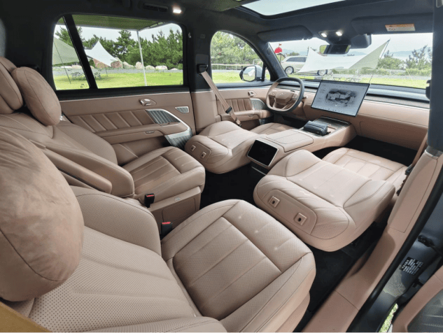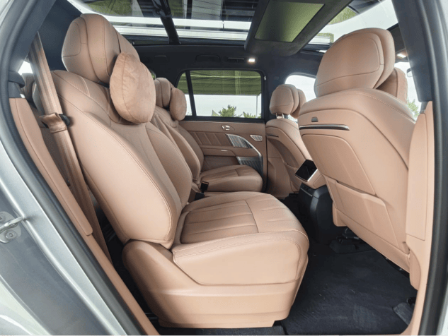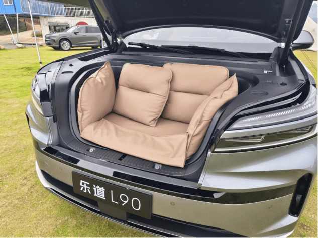 L90的前臉是一塊大立面,辨識度還是相當高的,分體式的大燈保留了家族設計風格。跟其他插混的大型SUV不同,這臺純電的車型,車頭給你留出了240L的行李箱,輕松放下2個20寸的登機箱是沒有問題的。