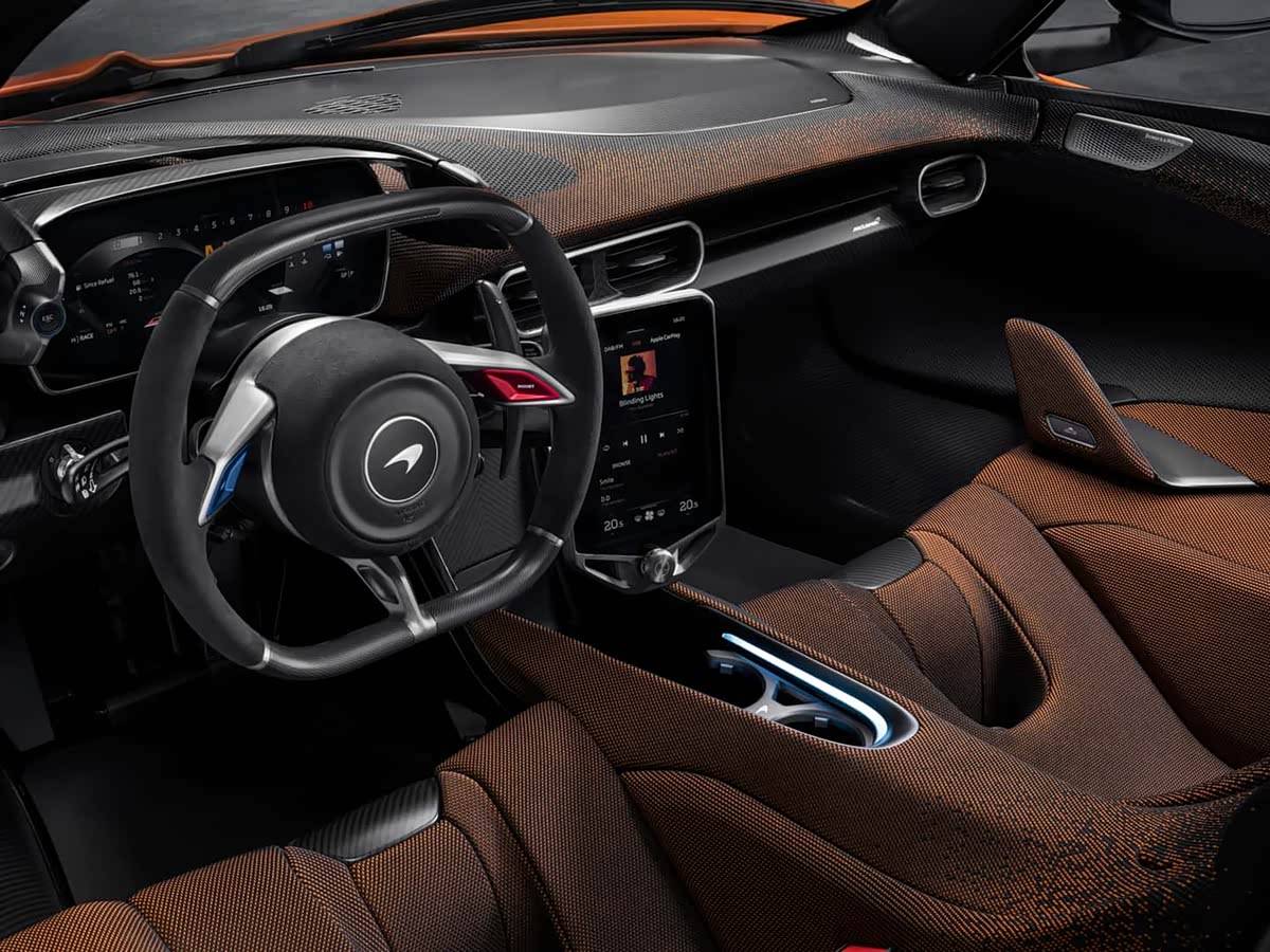 坐進車內,邁凱倫 W1 的內飾充滿了賽車風格與現代科技感。賽車風格的平底方向盤,不僅握感舒適,還融入了換擋指示燈,當發動機轉速接近 9200 轉 / 分鐘的極限時,指示燈會立即亮起,提醒駕駛者進行換擋操作,帶來極致的駕駛體驗。車內配備了全液晶儀表盤和 8 英寸縱置中控屏,中控屏支持 Apple CarPlay,方便駕駛者連接手機,實現導航、音樂播放等功能。賽車風格的桶形座椅,有著寬大的側翼,在激烈駕駛時能為駕駛者提供充足的側向支撐,讓駕駛者在高速過彎時也能穩穩地坐在座椅上。此外,在座椅之間設有杯架儲物區域,扶手后方還有小件物品存放空間,甚至在座椅后方還設計了一個行李存放架,只需將頭枕向前移動并折疊放平,便可輕松裝載各類物品,在追求極致性能的同時,也兼顧了一定的實用性。