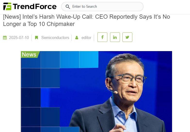 7月11日,據外媒報道,英特爾首席執行官陳立武近日在發表內部講話時直言英特爾已不再是領先芯片制造商,甚至不在前十。其市值如今僅約1000億美元,與18個月前相比大幅縮水,而英偉達市值卻一度突破4萬億美元,形成鮮明對比。