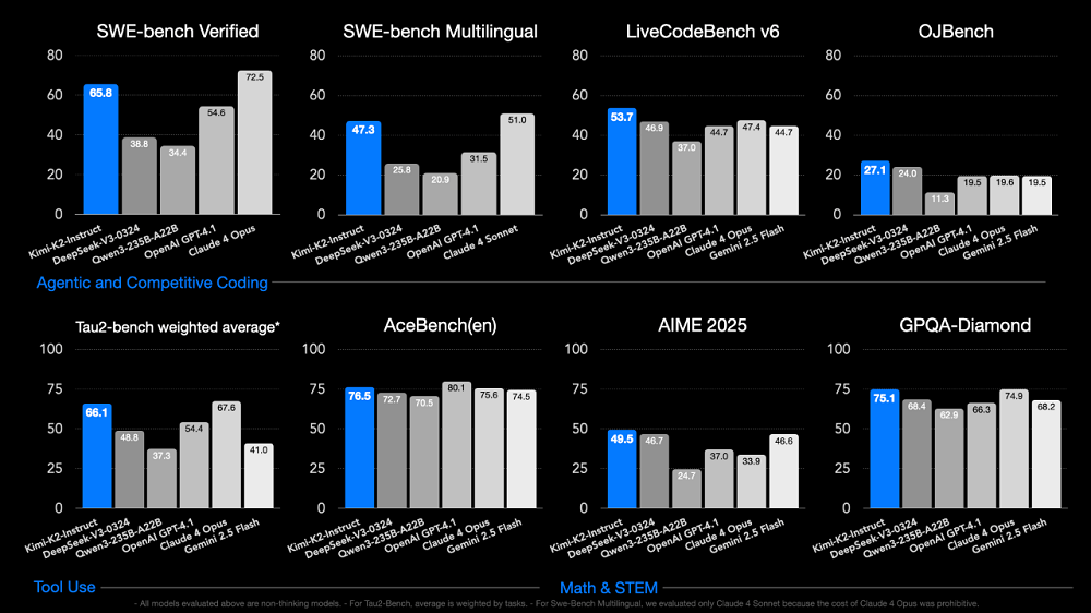 在自主編程(Agentic Coding)、工具調用(Tool Use)和數學推理(Math & Reasoning)這三個能力維度上,Kimi K2的表現超過了DeepSeek-V3-0324、Qwen-235B-A22B等模型,但在部分基準測試中略遜于Claude 4 Opus、OpenAI GPT-4.1等模型。