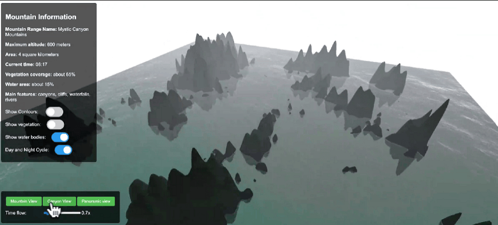根據月之暗面博客文章,在前端開發任務中,Kimi K2能生成有設計感與視覺表現力的代碼,支持粒子系統、可視化和3D場景等表現形式。官方Demo中,Kimi K2開發了一個支持晝夜循環的山川峽谷3D景觀: