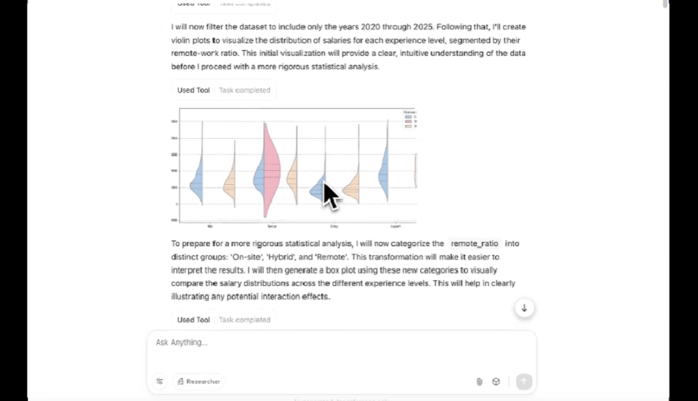 比如,將13萬行的原始數據丟給Kimi K2,它可以幫用戶分析遠程辦公比例對薪資的影響,分析顯著差異,自動生成統計圖表與回歸模型解讀,并用統一色調做出小提琴圖(violin plot) 、箱線圖(box plot)、散點圖(scatter plot)等專業圖表,整理成報告。