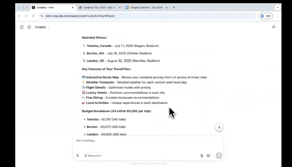 再比如,如果用戶是Coldplay粉絲,Kimi K2可以幫忙制定今年的追星計劃,完成演唱會所在城市的機酒與旅游規劃,并且生成日歷,再用html概括完整行程規劃并發送郵件。