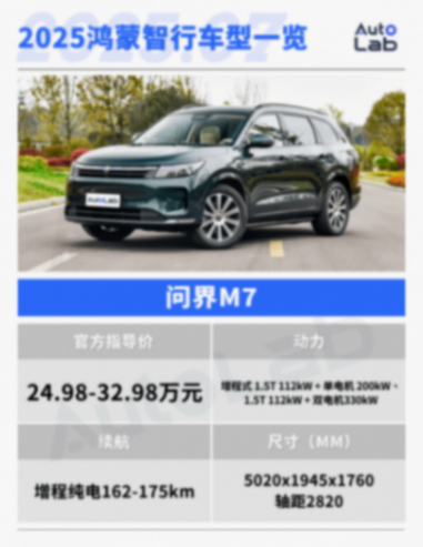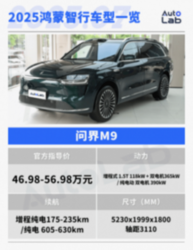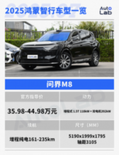 問界系列是鴻蒙智行與賽力斯合作的品牌,自2021年推出M5后,陸續推出M7、M9、M8等多款SUV,涵蓋了中型到大型、家用到商用等多個細分市場。