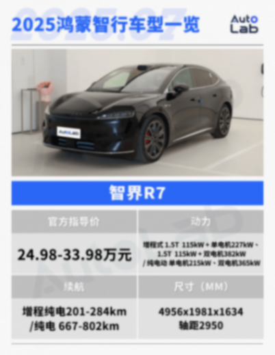 如果你喜歡SUV,則可以考慮定位為轎跑SUV的智界R7,它采用和S7相同設計語言,不過在動力上同時提供了純電和增程雙版本可選。