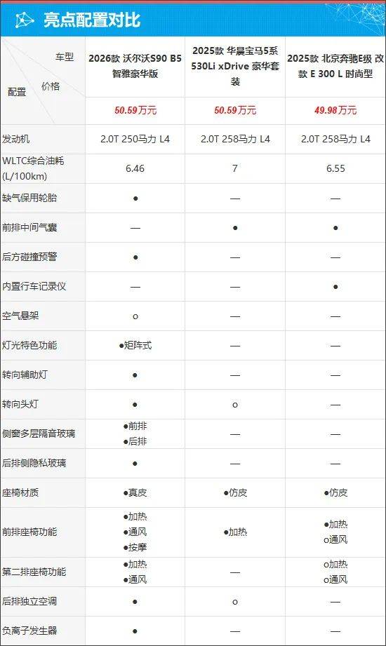具體到車輛配置層面,我們挑選了售價盡可能相近的車型。通過對比來看,雖然沃爾沃S90在動力參數(shù)上并不占優(yōu)勢,但WLTC綜合油耗最低,并且配置上獨享后方碰撞預(yù)警、矩陣式大燈、轉(zhuǎn)向輔助燈、前排/后排多層隔音玻璃、后排側(cè)隱私玻璃、前排座椅按摩、負離子發(fā)生器等功能,整體表現(xiàn)更加出眾。