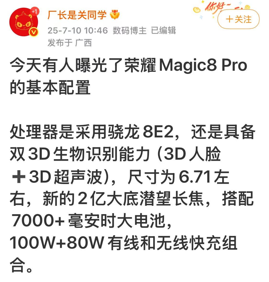 榮耀Magic8 Pro曝光,2億像素+驍龍8Elite2+7000mAh,預計5699元起