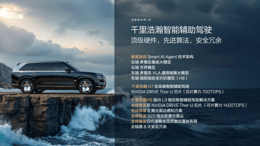 在智能駕駛方面,極氪也不再只是“跟上主流”,而是成為定義者。極氪9X搭載“雙Thor智駕芯片+五顆激光雷達(dá)+43顆感知硬件”,配合全冗余架構(gòu)的傳感器系統(tǒng),構(gòu)建出目前國內(nèi)最接近L3級(jí)能力的城市NOA方案,并率先實(shí)現(xiàn)無圖園區(qū)漫游和動(dòng)態(tài)語義理解能力。這足以說明,極氪已經(jīng)在算法、算力、感知布局上拉開技術(shù)代差。