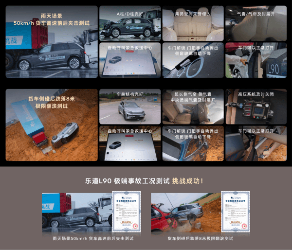 安全配置拉滿: 車身鋁合金+高強鋼比例高達84%,用了27.4kg的2000MPa“潛艇級”超高強度鋼(同級最高用量)。全車標配9安全氣囊,包括一根長達2.92m、56L超大容積的側氣簾,官方宣稱能覆蓋到第三排兒童頭部(135cm高度保護)。其氣囊數量和氣簾長度/容積均優于理想L8(7氣囊,氣簾長度未強調覆蓋第三排)和小鵬G9(6氣囊)。 智能安全方面,標配了行業唯二量產的“端到端AEB”在內的45項主動安全功能。中汽中心TOP Safety的雨天貨車高速前后夾擊挑戰,其嚴苛程度遠高于常規碰撞測試,樂道L90的通過為其安全性能提供了有力背書。