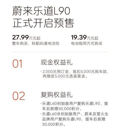 價格方面,整車購買27.99萬起,BaaS方案19.39萬起。對比理想L8的33.98萬起、小鵬G9的28.39萬起,樂道這個價格這個配置不可謂不是誠意滿滿。而且現在預售期間下訂,并在8月31日前鎖單,還可以享受2000元訂金抵5000元車款,再送5000元選裝基金。樂道L60的老用戶復購,最高還能拿5萬積分。