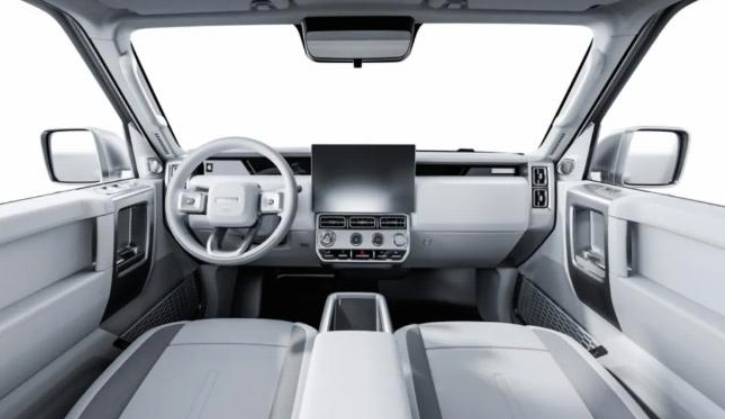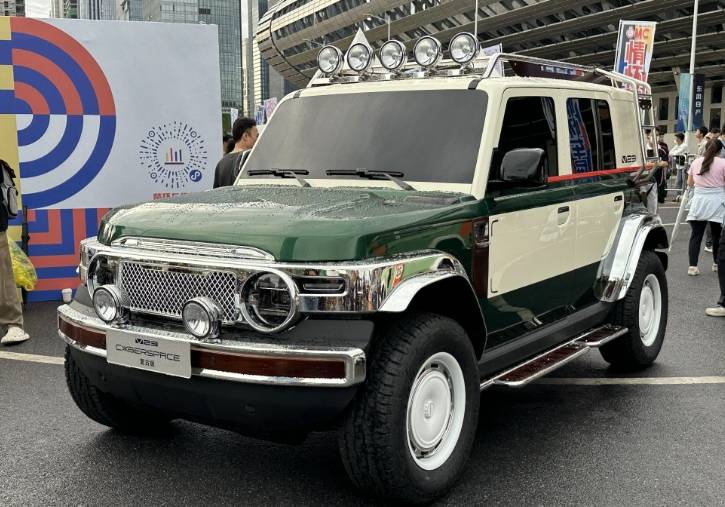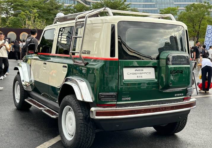 車身配色方面,iCAR V23 CYBERSPACE復古版采用祖母綠和白色的雙色搭配。車身附件上,新增了前保險杠射燈、車頂射燈、鍍鉻圓管式車頂架、側置爬梯以及白色“鍋蓋”式輪輞等。