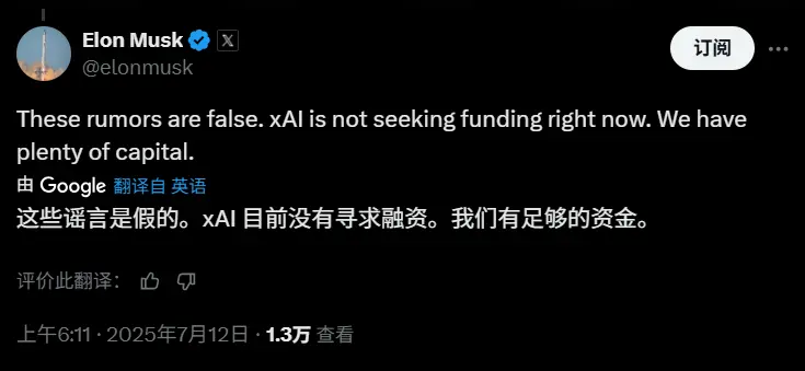 xAI目前并未尋求融資,我們有充足的資本。