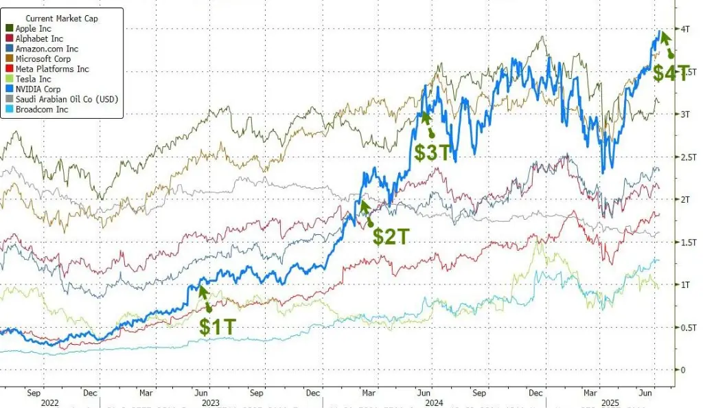 與此同時華爾街見聞曾提及,英偉達自身也正經歷里程碑式的時刻。周三英偉達市值一度站上4萬億美元大關,隨后周四正式成為全球首家市值突破4萬億美元的公司,超越了微軟和蘋果。