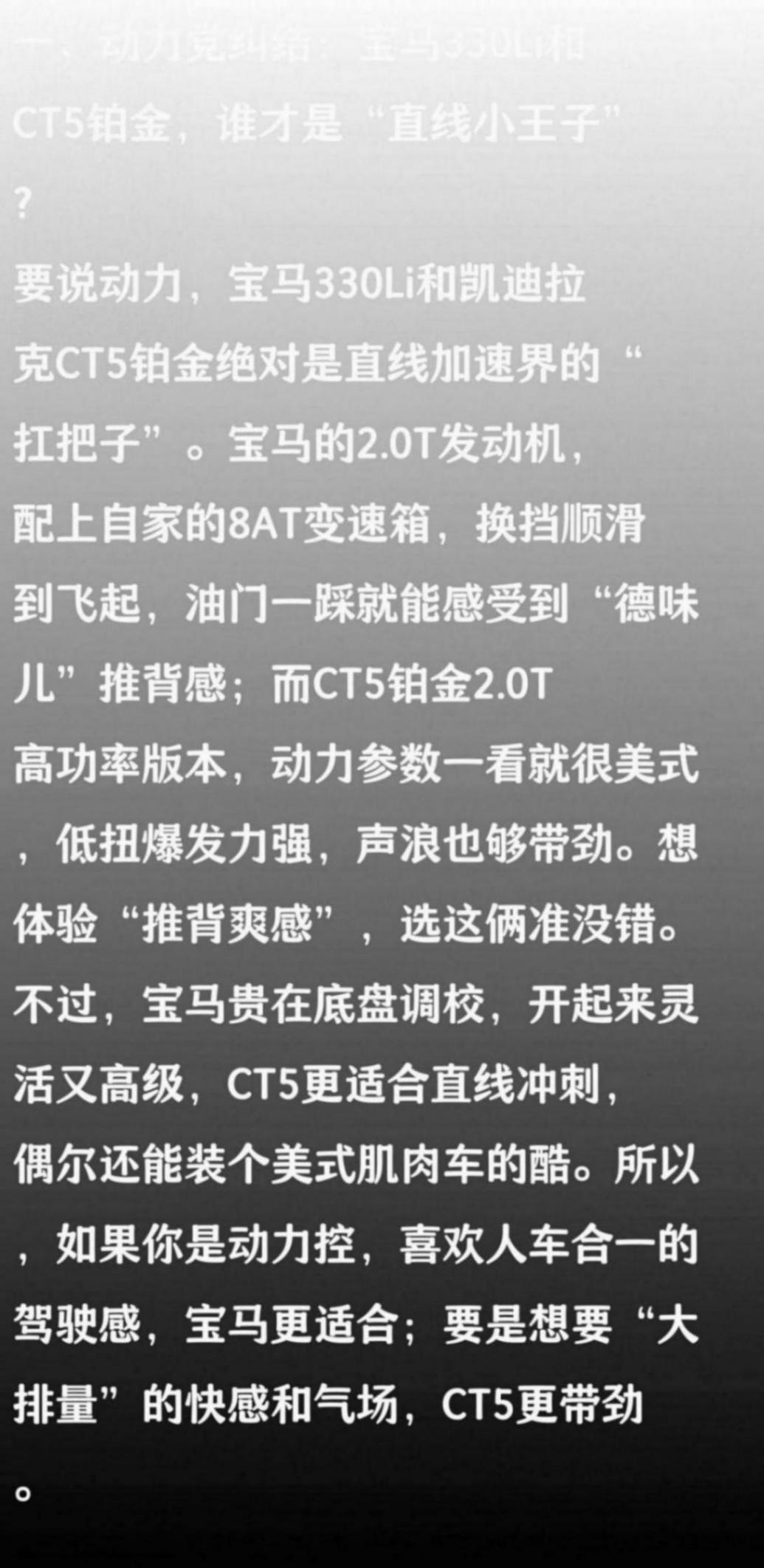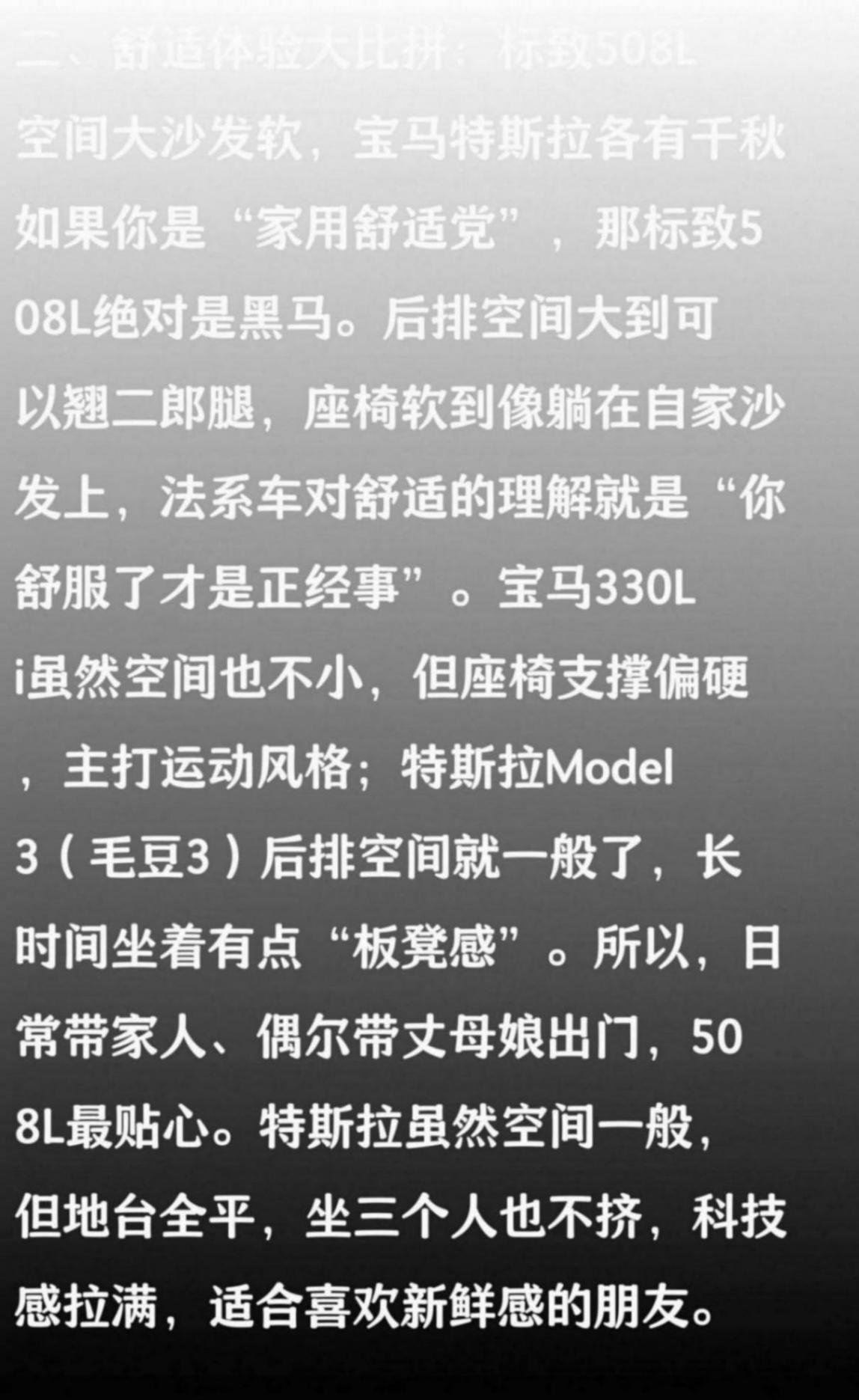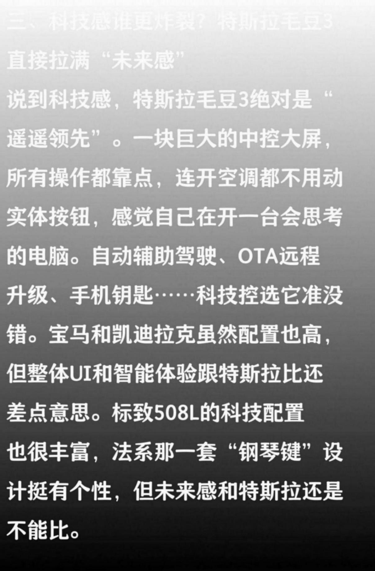 我表哥去年剛換車,這四款他全都試了,真是磨嘰半個月,天天拉著我陪著去店里,寶馬330Li他一屁股坐進去就喊腿伸不開,后排沒戲,媳婦嫌小,標致508L便宜是真便宜,開起來沒啥存在感,內飾那塑料味兒,媳婦說看著掉價,CT5鉑金那天我們倆下班去看的,坐進去挺寬敞,動力推背感有,油耗高點,特斯拉毛豆3我真不習慣,內飾光禿禿的,啥都靠屏幕,冬天開空調掉電快,最后他媳婦一錘定音選的CT5,家用還帶點面子...