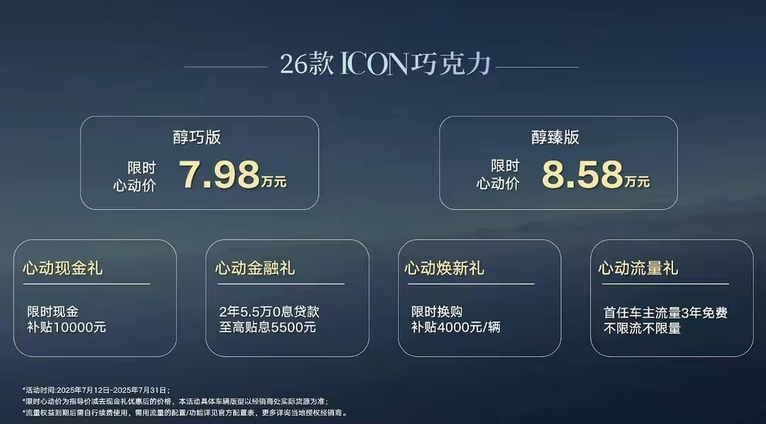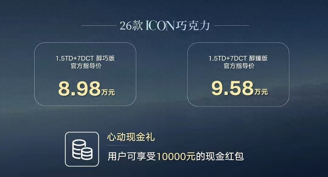 7月12日,2026款吉利ICON巧克力上市,此次共推出2款配置車型,官方指導(dǎo)價為8.98萬-9.58萬元,限時心動價7.98萬-8.58萬元,作為年度改款,新車售價相比2025款進(jìn)行了下調(diào),并且針對內(nèi)飾做了升級。