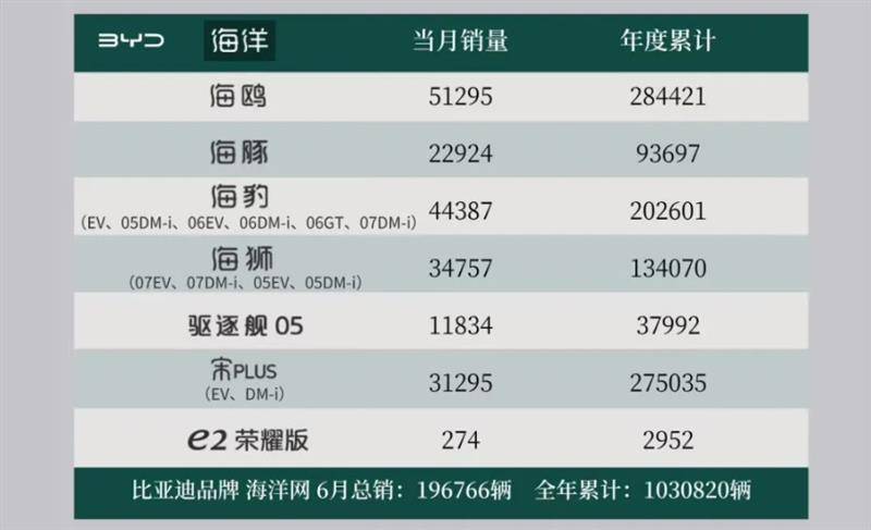 除王朝網之外,目前比亞迪另一銷量支柱板塊為“海洋網”。數據顯示,比亞迪海洋網今年上半年累計銷售103.08萬輛,累計同比增長39%。具體來看,其中宋PLUS(EV、DM-i)累計銷售27.5萬輛;海鷗、海豹、海獅、海豚以及驅逐艦05分別累計銷售28.44萬輛、20.26萬輛、13.4萬輛、9.37萬輛和3.8萬輛,海洋網旗下產品的熱銷已經反超王朝系列。
