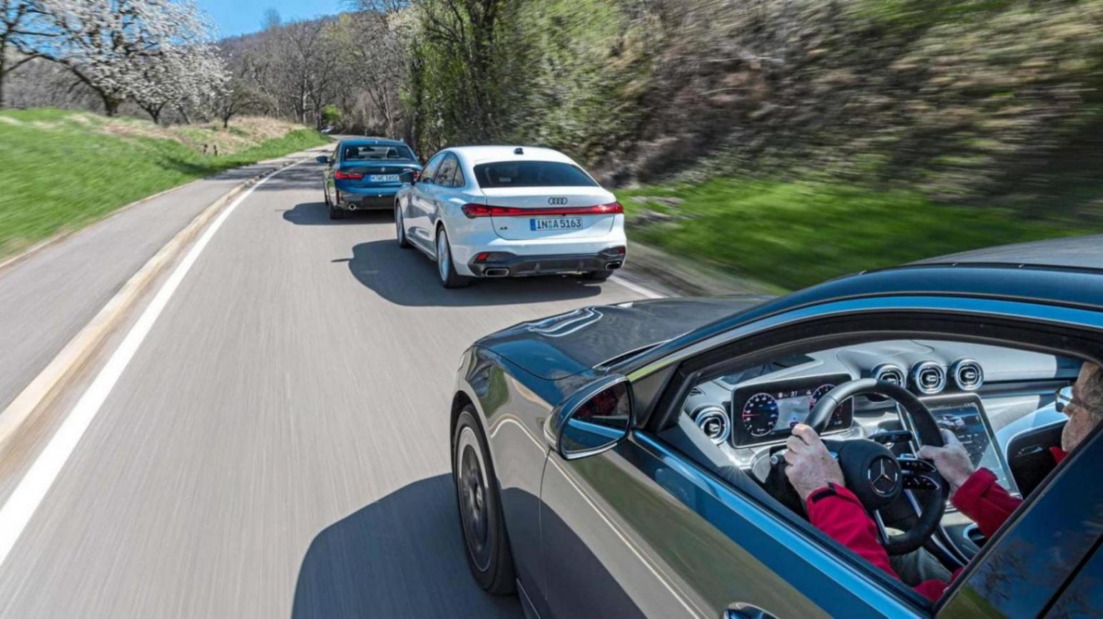奔馳的整體調校更為和諧。即便在“運動”模式下,其懸掛硬度也只相當于寶馬的標準模式。在破損道路上的表現尤為明顯:當我們以80公里/小時駛過一處大坑洼路段時,奧迪與奔馳都能平穩處理起伏,寶馬則需靠ESP穩定系統介入。雖然ESP表現出色,但本質上也反映了三者調校理念的不同。