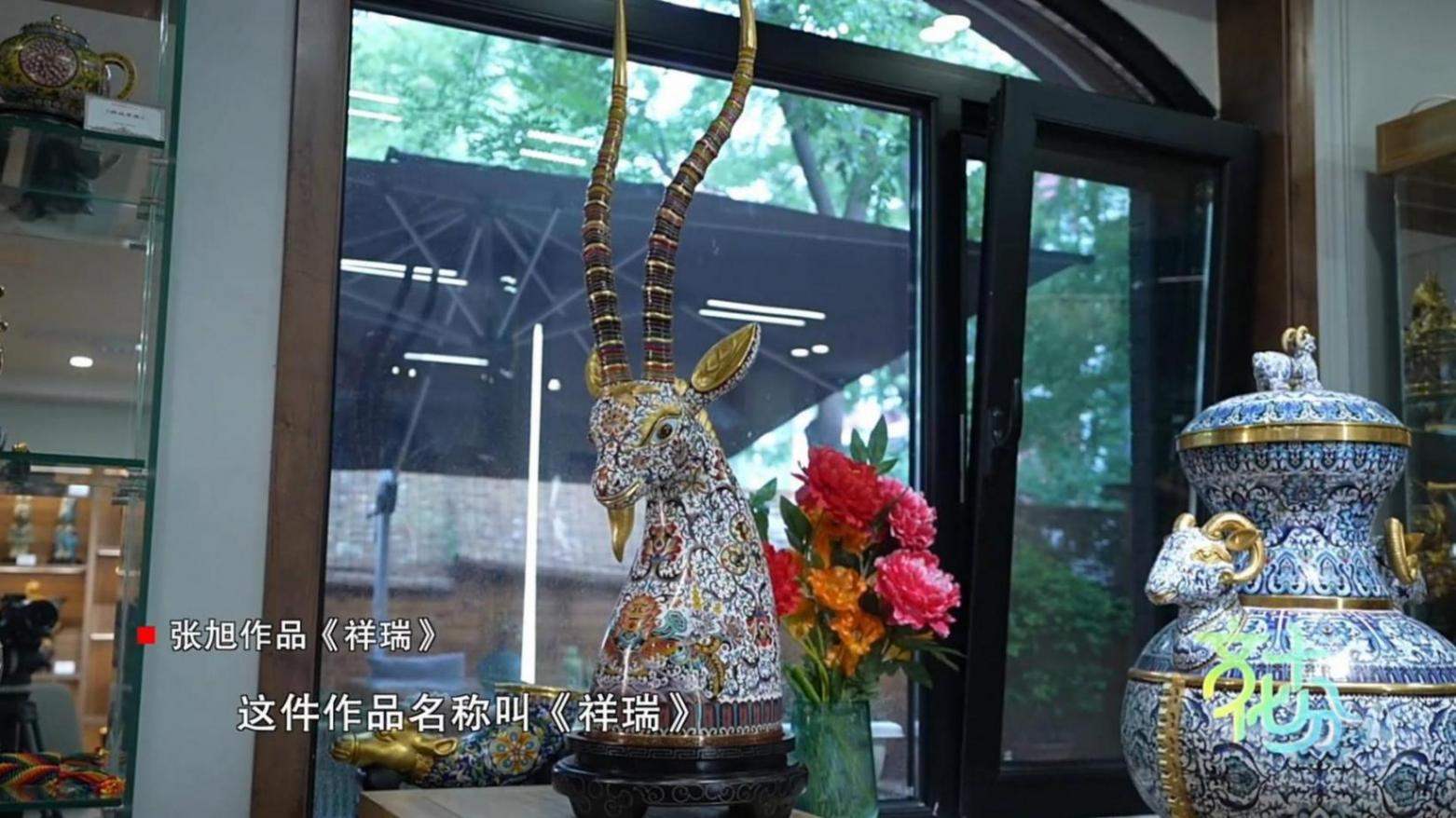 張旭:這件作品名稱叫《祥瑞》,我在創作上也很多的時候會考慮用現代這種雕塑藝術體現景泰藍的造型。其實藏羚羊的羚羊角很短,我在創作時候做成了一個夸張的處理,讓它有一個向上伸展,積極向上、健康茁壯成長的寓意。