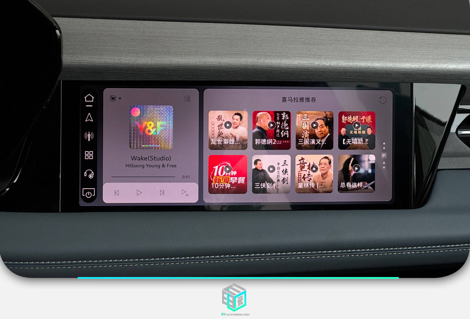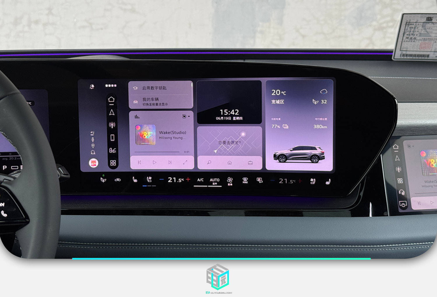 車內同樣是最新一代的座艙設計語言,從主駕看去是一個曲面雙聯屏,其材質為OLED,顯示效果細膩,車機內也加入了部分本地化APP,不過其系統操作邏輯上還是需要一定的學習才更好上手。副駕也加入了一塊娛樂屏,內部能操作一些與駕駛不相關的功能。
