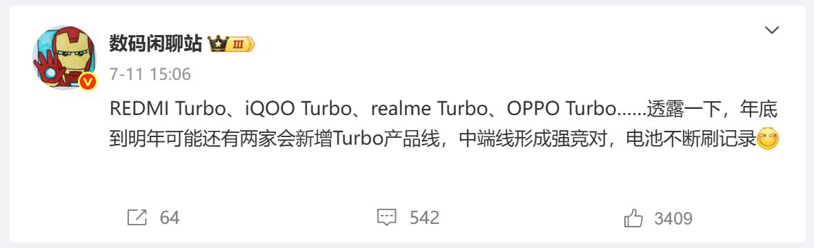 對此,知名爆料博主數碼閑聊站表示,Turbo系列越來越多:REDMI Turbo、iQOO Turbo、realme Turbo、OPPO Turbo。
