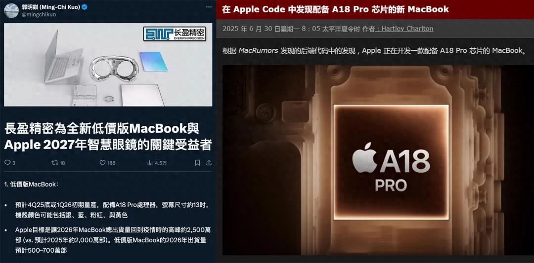 前段時間,分析師郭明錤曾爆料稱,蘋果將推出一款搭載A18 Pro芯片MacBook,定位為該產品線的平價款。