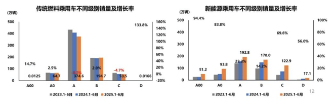 受新能源汽車的擠壓與持續(xù)的價(jià)格戰(zhàn),B級(jí)傳統(tǒng)燃油乘用車市場(chǎng)呈現(xiàn)出增長(zhǎng)態(tài)勢(shì),上半年累計(jì)銷量達(dá)到194.7萬(wàn)輛,同比增長(zhǎng)2%,但A級(jí)車依舊是傳統(tǒng)燃油乘用車市場(chǎng)的銷量主力,累計(jì)銷量為374.6萬(wàn)輛,同比下降8.3%。