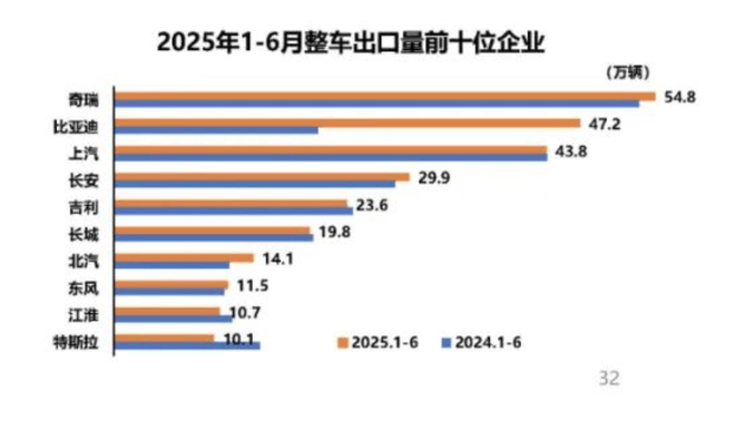、吉利、長(zhǎng)城雖保持整車出口前十企業(yè)的腰部格局,但三家車企之間的出口量差距正逐步縮小。與去年同期相比,江淮與特斯拉掉至隊(duì)尾,出口量分別為10.7萬(wàn)輛和10.1萬(wàn)輛。