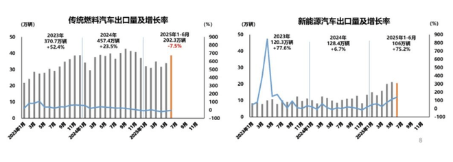 今年上半年,汽車出口超過(guò)300萬(wàn)輛,達(dá)308.3萬(wàn)輛,同比增長(zhǎng)10.4%。其中,傳統(tǒng)燃料汽車出口202.3萬(wàn)輛,同比下降7.5%;新能源汽車出口106萬(wàn)輛,同比增長(zhǎng)75.2%。